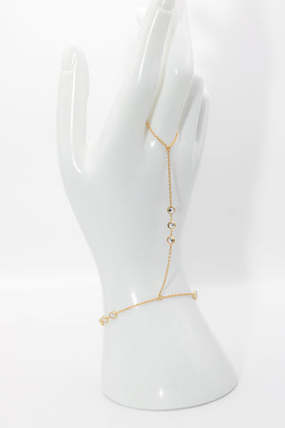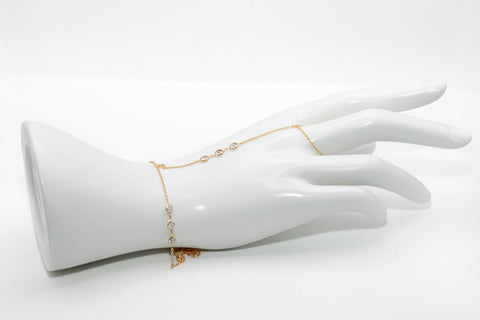 Designed to connect ring and wrist in a seamless, flowing silhouette, this piece glimmers with intention and elegance. Lightweight and adjustable, fits small to medium wrists. For larger sizing, leave a note at checkout to request an extender.