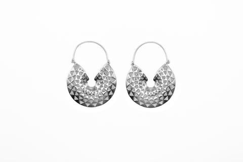 Crafted in sterling silver and filled with warm rose gold, these tribal-inspired hoops are shaped with soft curves and artisinal texture, evoking the glow of sunset descending behind ancient hills.